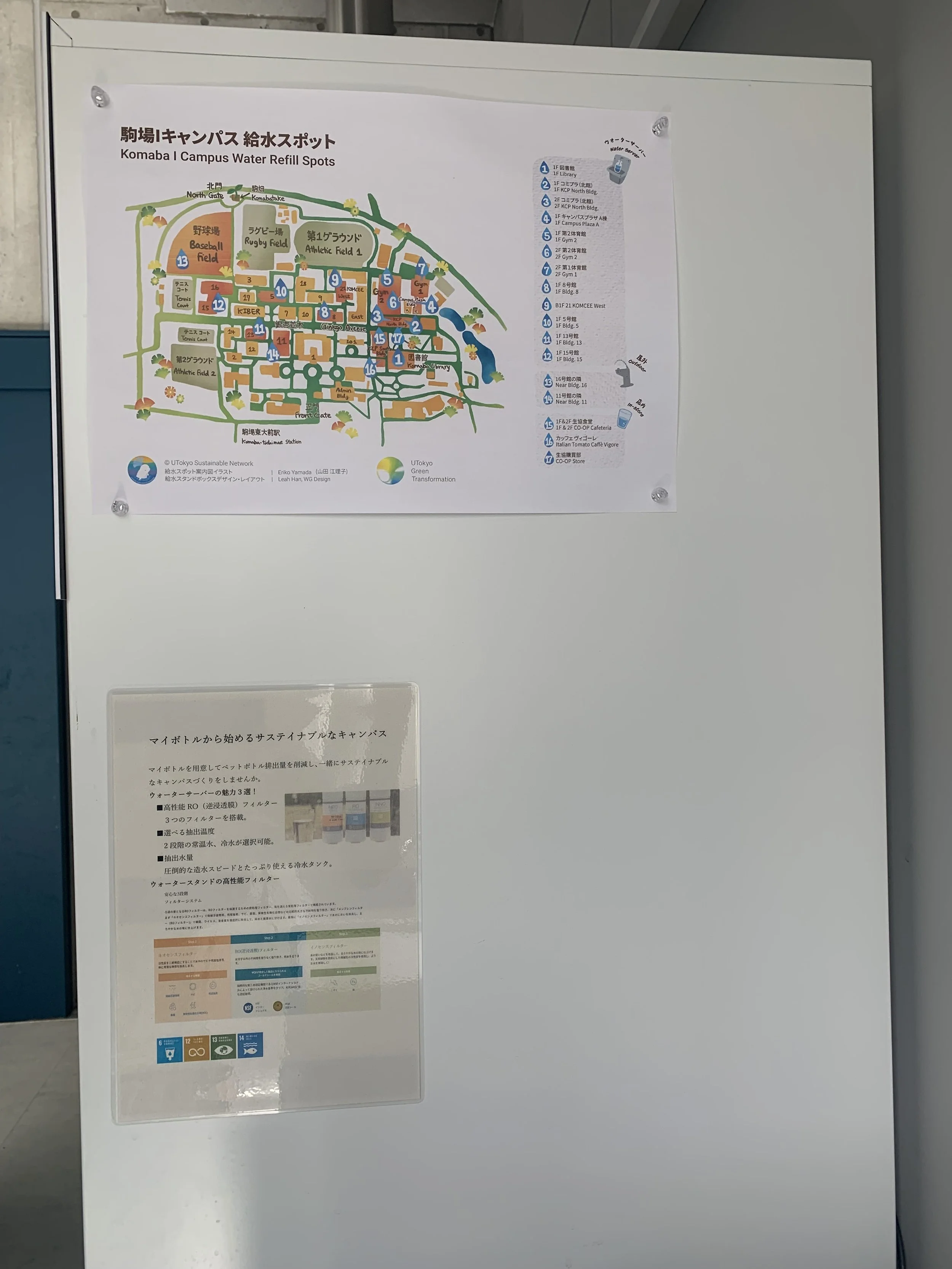 マヒ・リア:この企画書「私たちが行動した」ことの証です。実際に導入してくれたのは大学なので、ウォーターサーバーには「UTokyo Green Transfromation」と大きく書いてあります。一方で「UTSN」は、その横に貼ってある私たちが作成したマップとポスターに書いてあるだけです。「努力すれば学生も変化を起こせる」と知ってもらうために、掲載しようと思いました。そして、見た人が何か行動を起こすきっかけになればと思っています。